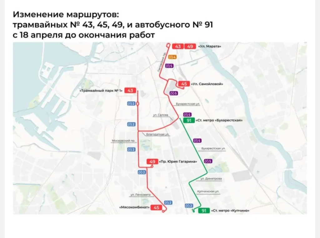 Для компенсации изменений организован новый автобусный маршрут №91, который свяжет станции метро «Купчино» и «Бухарестская». Дополнительно усилена работа автобусного маршрута №57.